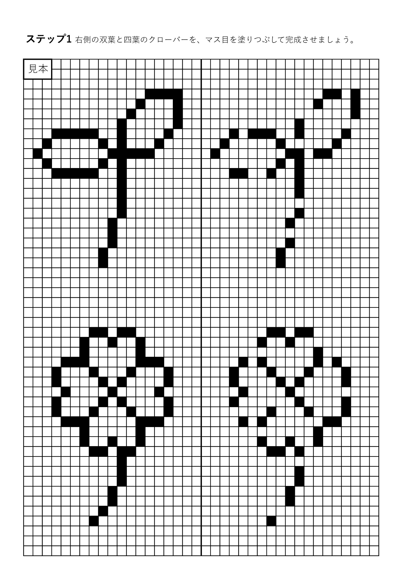 右側の双葉と四葉のクローバーを、マス目を塗りつぶして完成させてみましょう。